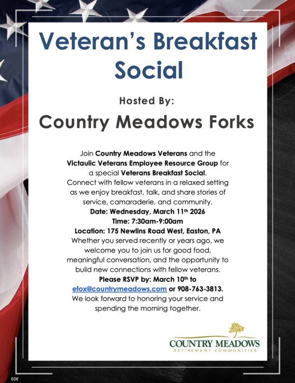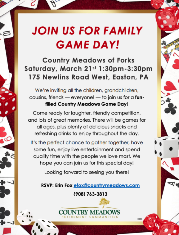 Here, our doors are open to community members to join us for events and activities such as open houses, wine and cheese tastings, art classes and educational programs. We welcome you to contact our Forks Twp. of Easton team about any programs you are interested in at Forks@CountryMeadows.com. Look forward to seeing you.