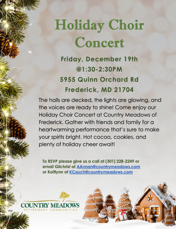 Our doors are open welcoming community members to join in on activities and events like open houses, wine and cheese tastings, art classes and educational programs. Contact our Frederick team any time to learn more at Frederick@CountryMeadows.com. See you soon!