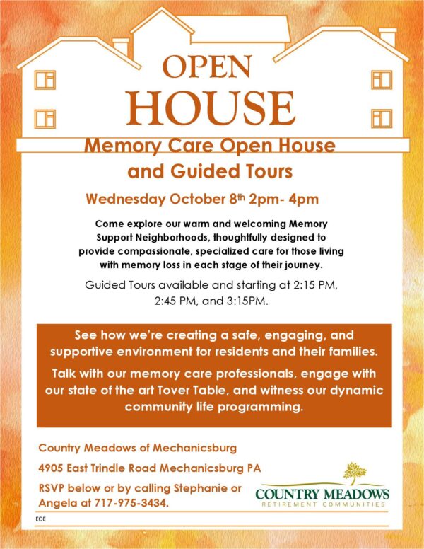 From open houses and wine and cheese tastings to art classes and educational series, we invite anyone to join our community programs. Contact our Mechanicsburg team any time about any events and activities you would like to attend at Mechanicsburg@CountryMeadows.com. Look forward to seeing you soon.