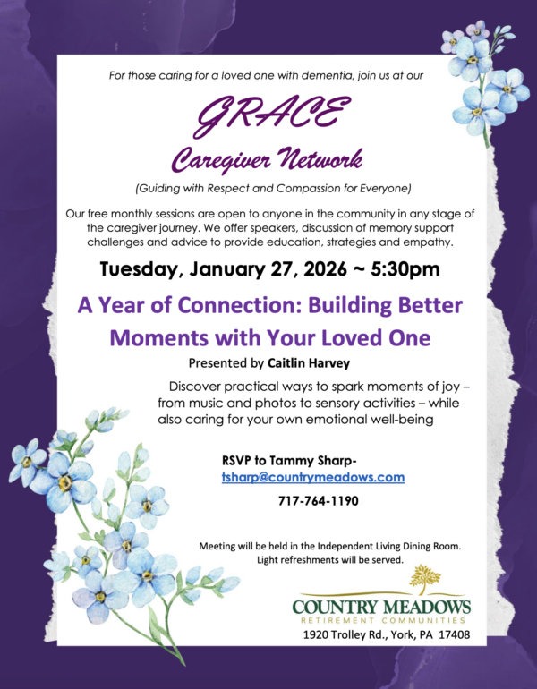 Here, our doors are open to community members to join us for free activities and events from open houses and wine and cheese tastings to art classes and educational programs. We welcome you to contact our York-West team about any program you are interested in at York@CountryMeadows.com. Look forward to seeing you.