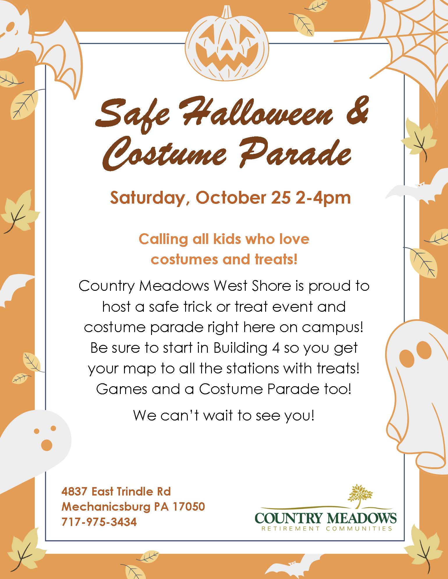 Country Meadows West Shore is proud to host a safe trick-or-treat event and costume parade right here on campus!