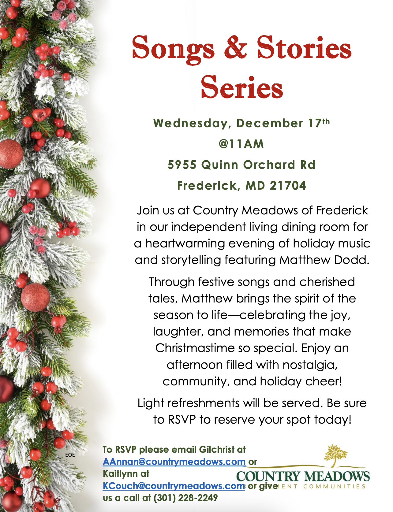 RSVP please email Gilchrist at AAnnan@countrymeadows.com or Kaitlynn at KCouch@countrymeadows.com or give us a call at (301) 228-2249