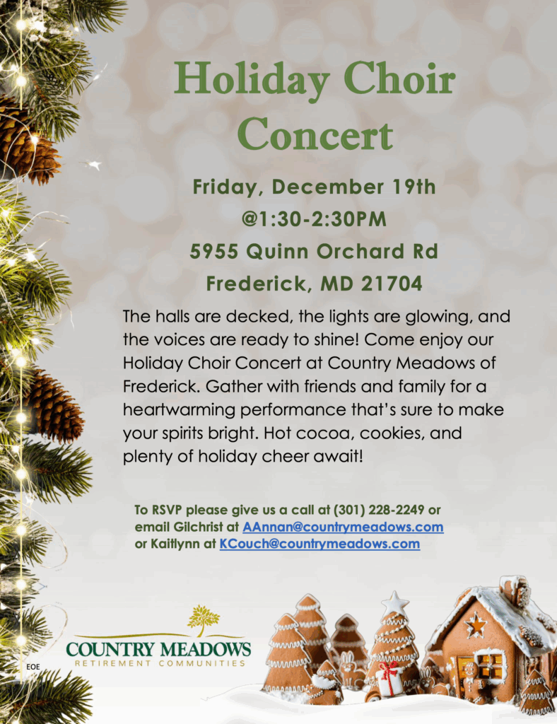 RSVPs kindly requested 2 days prior to each tour to Frederick@CountryMeadows.com or 301-228-2249