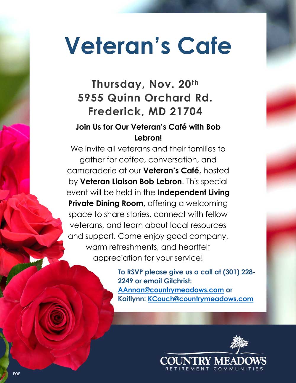 We invite all veterans and their families to gather for coffee, conversation, and camaraderie at our Veteran’s Café, hosted by Veteran Liaison Bob Lebron. This special event will be held in the Independent Living Private Dining Room.