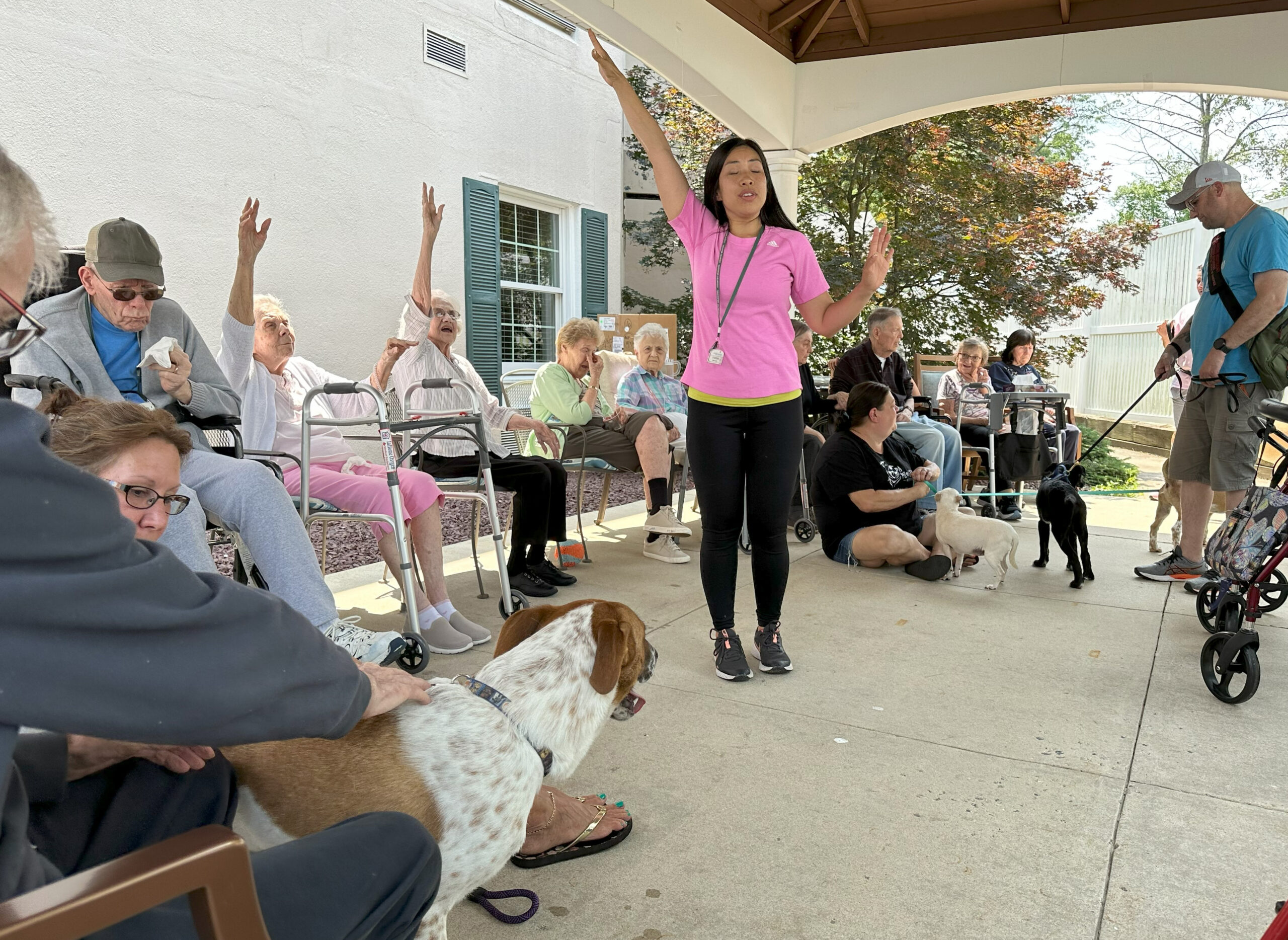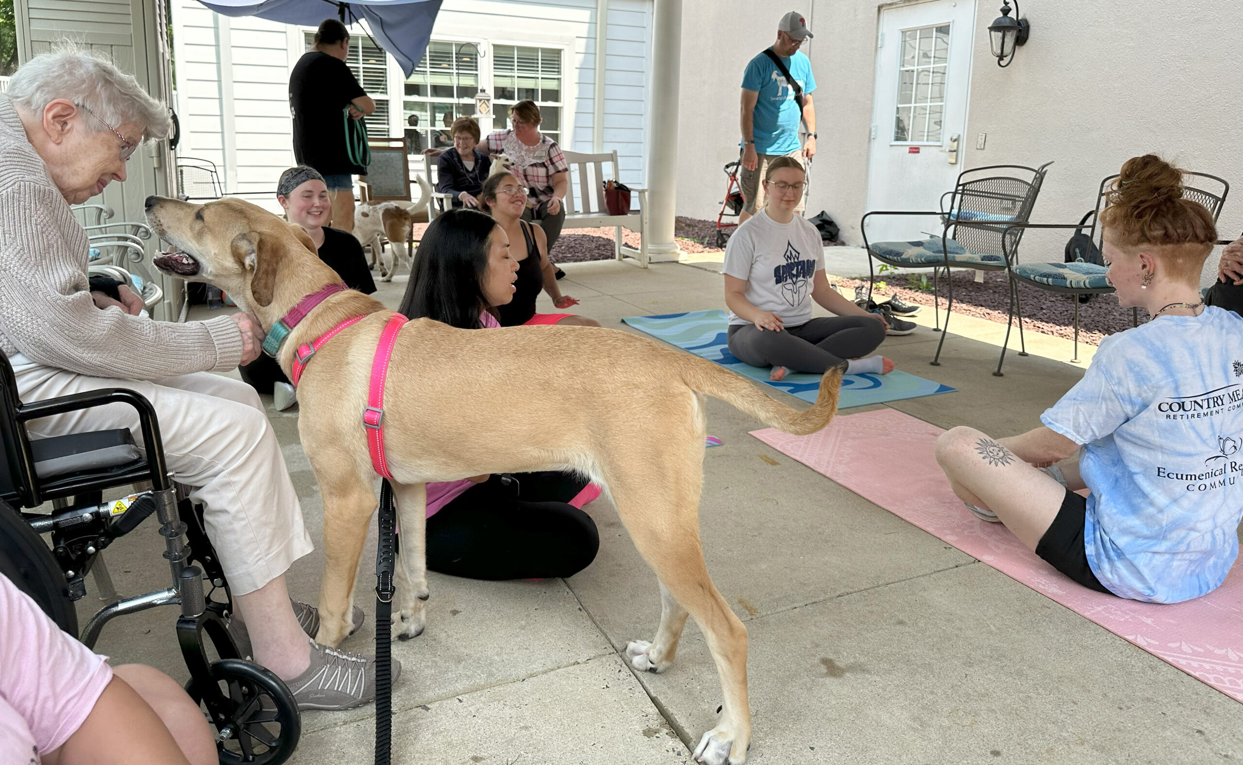 It is just like it sounds: puppies from PA Pit Stop Rescue in Berks County wandered around Country Meadows’ enclosed courtyard while residents and co-workers enjoyed outdoor yoga classes. Puppy yoga combines the benefits of yoga, such as stretching, relaxation and mindfulness, with the joy and therapeutic effects of being around dogs.