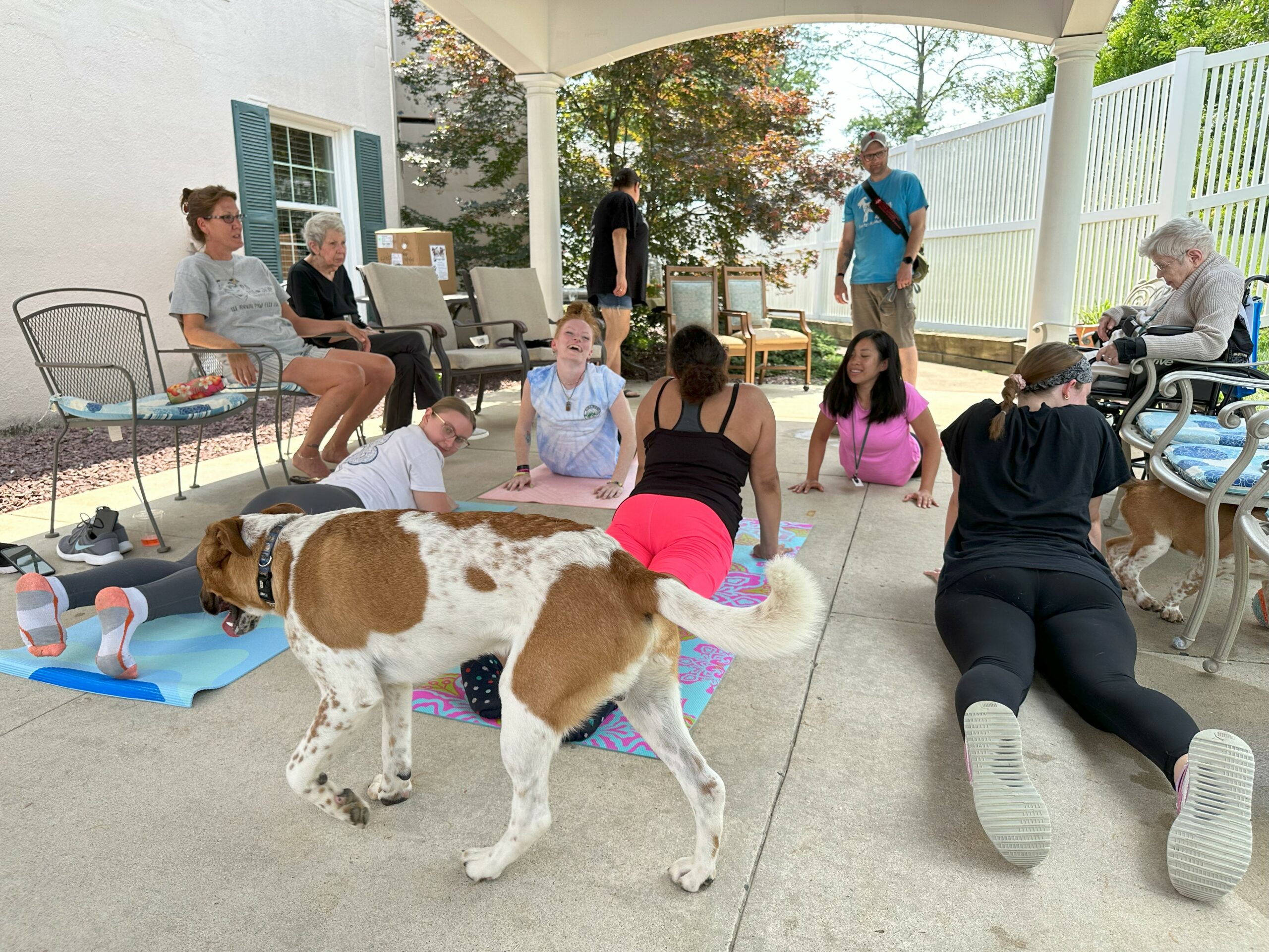 Wyomissing campus residents and co-workers enjoyed the dog days of summer while stretching, smiling and snuggling during a puppy yoga class.